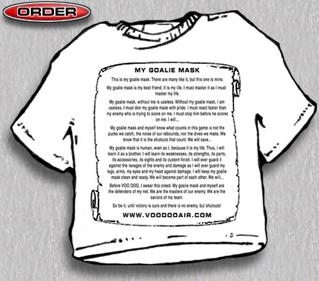 BACK TO PREVIOUS PAGEmaster my life. useless. I must don my goalie mask with pride. I must react faster than my enemy who is trying to score on me. I must stop him before he scores on me. I will... pucks we catch, the noise of our rebounds, nor the dives we make. We know that it is the shutouts that count. We will save... learn it as a brother. I will learn its weaknesses, its strengths, its parts, its accessories, its sights and its custom finish. I will ever guard it against the ravages of the enemy and damage as I will ever guard my legs, arms, my eyes and my head against damage. I will keep my goalie mask clean and ready. We will become part of each other. We will... the defenders of my net. We are the masters of our enemy. We are the saviors of my team. |